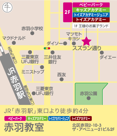 電車でお越しの方 JR線:赤羽駅、東口を出たら、駅前広場をまっすぐ「マツモトキヨシ」さんの方へ歩きます。 (東口改札にはエレベーターがございません。南口改札方面ですとエレベーターがございます。ベビーカーの方はご注意ください。) 「マツモトキヨシ」さんの左側に沿うように通りへと出て、右手に「大和証券」さん、「みずほ銀行」さんを見ながら直進。 目の前に見えてくる商店街「LaLaガーデン(赤羽スズラン通り)」に入り、直進します。 アーケードの下をしばらく進むと左側に見える「王様のお菓子ランド」さんが1階に入る建物の2階に教室が入っています。徒歩約4分です。 車でお越しの方 専用駐車場はございませんので、近隣のコインパーキングをご利用ください。 【自転車でお越しの場合】 駐輪場はアーケード内の駐輪場です。(10時から利用可) 【ベビーカーでお越しの場合】 ベビーカーの置き場所は2階玄関横です。中でたたまずそのまま置いていただけます。 |