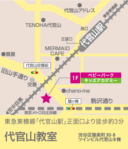 電車でお越しの方 東急東横線:代官山駅、中央口を左に出て、突き当りを右に曲がります。 その後左手に見えてくる「DooWop」さんの角を左折し、しばらく直進します。 大きな通り(旧山手通り)に出たら左に進み、1つ目の信号を右に、「育良ビル」さん側へ渡ります。 信号を渡り終えたら右に進み、2軒目の建物「ツインビル代官山B」1階に教室が入っています。徒歩約3分です。 車でお越しの方 専用駐車場はありませんので、近隣の駐車場をご利用ください。 【ベビーカーでお越しの場合】 ベビーカーは教室内に置ていただけます。 専用駐車場はございませんので、近隣のコインパーキングをご利用ください。 教室への入り口は、一度「ツインビル代官山B」を通り過ぎ、建物右側にございます駐車場奥へと進むと左側に教室の入り口があります。 ※教室の看板のある駐車場内から、建物に沿って一番奥までお進みください。 |
