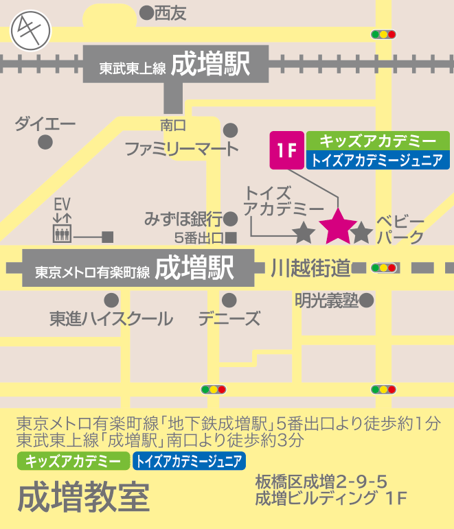 トイズアカデミージュニア成増教室は3~6歳向けの幼児教室。東京メトロ有楽町線・東武東上線成増駅から徒歩約1~3分と通いやすく、子どもが「勉強って楽しい!」と感じながら、思考の土台を築き、自ら学ぶ力を育みます。言語、数量、空間認識の力を育み、6歳までにIQ130以上を目指します。