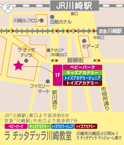 電車でお越しの方 【JR線川崎駅からお越しの場合】 中央改札を出て東口方面に進みます。エスカレーターを降り、右側ルフロン方面に向かいます。 ルフロン前の信号を渡ったら左へ、大通りの信号(高架下)を渡ります。 進行方向まっすぐに進み 角に「串かつでんがな」さんが見えたら、VIA CINECITTA通りを右折します。(エスカレーターをご利用の場合、36番出口を出たらここに出ます。) (※に続く) 【京急線からお越しの場合】 川崎駅、中央口を右に出たら、左のWing方面へ進行方向まっすぐに進みます。 「川崎駅前東」交差点を渡ります。モアーズ横を通りすぎ「川崎駅前南」交差点を左へ進みます。 角に「串かつでんがな」さんが見えたら、VIA CINECITTA通りを右折します。(エスカレーターをご利用の場合、36番出口を出たらここに出ます。) ※VIA CINECITTA通りを進むと左手に「ファミリーマート」さんが見えてきて、その先左手に噴水広場があります。 階段を上った先が「ラチッタデッラ マッジョーレ棟」です。1階「タワーレコード」さん横に教室が入っております。 JR川崎駅東口より徒歩約5分、京急川崎駅中央口より徒歩約7分です。 車でお越しの方 専用駐車場はございませんので、近隣のコインパーキングをご利用ください。 【自転車でお越しの場合】 駐輪場はラチッタデッラ内にございます。 【ベビーカーでお越しの場合】 ベビーカーの置き場所は教室の入り口外側です。 |