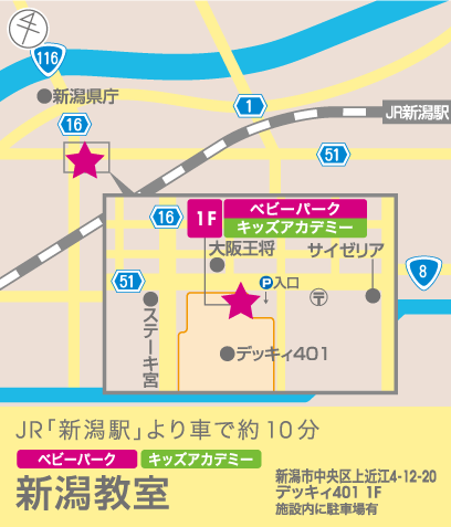 ベビーパーク新潟教室は0~3歳の子育てを応援する親子教室。JR新潟駅から車で10分で通いやすく、知育遊び・育児相談・ママパパ向けの学びを通して、叱らない育児や子どもの発達を楽しく学び、親子の絆を育みます。