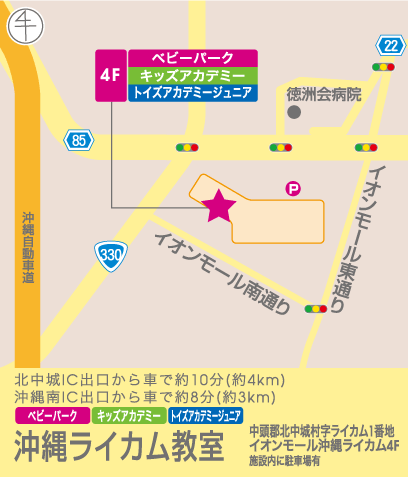 北中城IC出口から車で約10分(約4Km)、沖縄南IC出口から車で約8分(約3Km)のところにある「イオンモール沖縄ライカム」の4階に教室が入っております。