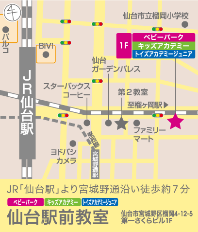 電車でお越しの方 JR線:仙台駅、東口を出たら駅前ロータリーの正面、宮城野通の右側を歩きます。(地下鉄東西線:宮城野駅からお越しの場合は宮城野通を目指して歩き、右折します。) 宮城野通りを少し歩くと右手2階にベビーパークが入る建物がございますが、そちらは第2教室ですので、そのまま直進します。 しばらく歩くと右手に教室が1階に入る建物「第一さくらビル」がございます。徒歩約7分です。 榴ヶ岡駅からお越しの場合は、2番出口を出たら背中方向へと歩き(左手に「ファミリーマート」さんが見えます。)、しばらくすると左手に教室が見えます。徒歩約4分です。 車でお越しの方 専用駐車場はございませんので、近隣のコインパーキングをご利用ください。 【自転車でお越しの場合】 教室玄関前に置いていただけます。 【ベビーカーでお越しの場合】 ベビーカーは教室玄関内に置いていただけます。 |