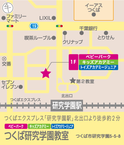 つくば研究学園教室は駅から徒歩3分程度の場所にあり、建物の1階なので、ベビーカーでもお通いいただきやすい教室です。