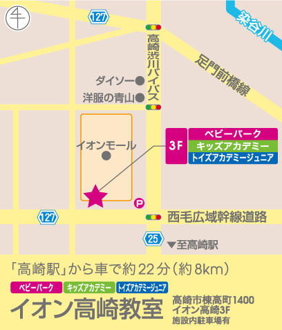 電車でお越しの方 JR線:高崎駅からイオンモール高崎行きのバスでお越しください。 「イオンモール高崎 イオンスタイル」の3階に教室が入っております。 車でお越しの方 JR線:高崎駅より車で22分。イオンモール高崎の無料駐車場をご利用ください。 【ベビーカーでお越しの場合】 ベビーカーは教室内にそのまま置いていただけます。台数が多い時には折り畳みのご協力をお願い致します。 |