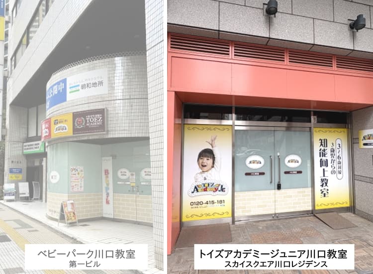 JR京浜東北線 川口駅東口から徒歩約5分 川口駅には「ベビーパーク川口教室」(第一ビル)と「トイズアカデミージュニア川口教室」(スカイスクエア川口レジデンス)がございます。 ベビーパークのレッスンは「ベビーパーク川口教室」(第一ビル)にて行っております。 それ以外のキッズアカデミー、トイズアカデミージュニア、トイズアカデミーのレッスンはどちらの教室でも行っております。 体験レッスンのご予約先をご確認の上、お間違いのないようにお越しください。 |