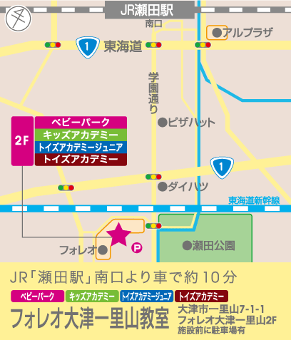 JR線:瀬田駅から北に車で約10分のところにある、「フォレオ大津一里山店」の2階に教室が入っております。
