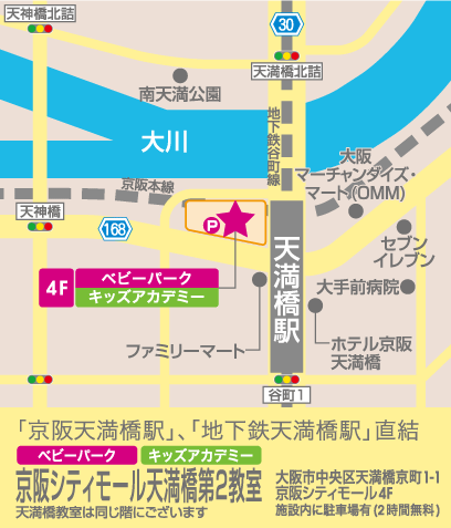 京阪線・大阪メトロ谷町線:天満橋駅、2番出口直結「京阪シティモール」4階に教室がございます。
