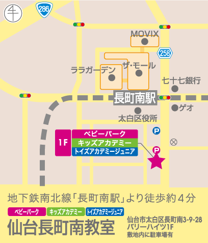 電車でお越しの方 地下鉄南北線:長町南駅、西出口1を出たら左に歩きます。 仙台市太白区役所前の横断歩道を渡り、左に進みます。(区役所を左に見ながら進む) 大きな通りへと突き当ったら、建物沿いに右折します。 その後、1つ信号を渡った先の右角にある建物の1階に教室が入っております。徒歩約4分です。 車でお越しの方 建物横「1・2・3・4・5」の5台、建物裏「軽専用(番号無)」の1台が教室専用駐車場です。 【自転車でお越しの場合】 専用駐輪場はございません。教室の前にお停めください。 【ベビーカーでお越しの場合】 ベビーカーは教室の中に置いていただけます。折り畳みのご協力をお願い致します。 |