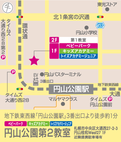 | 電車でお越しの方 地下鉄東西線:円山公園駅、3番出口を出たら背中方向へ歩き、建物沿いに左へ曲がります。 1つ目の横断歩道を渡り左折。右手すぐのところに見える建物の2階に教室が入っております。徒歩約1分です。 車でお越しの方 近隣に提携駐車場がございます。駐車料金一部負担 (先生から駐車券をお受け取りください。300円の補助券がございます。) ・タイムズ大通り西28 ・タイムズ大通り西28第2 ・タイムズ円山公園駅前 ・タイムズ南2西24 ※駐車場が混みあってる可能性がありますので、余裕を持ってお越しください。 【自転車でお越しの場合】 円山公園1番出口の横、神社の向かいに駐輪場がございます。 【ベビーカーでお越しの場合】 ベビーカーは入り口に置いていただけます。折りたたみのご協力をお願い致します。 ※2階にもベビーパークがございますが、そちらは第1教室ですので、ご注意ください。 |