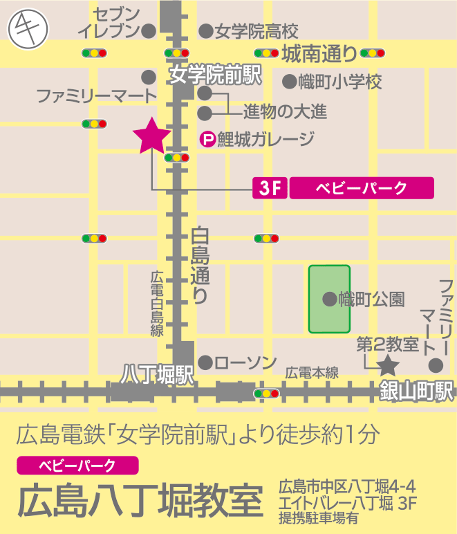 電車でお越しの方 広島電鉄バス 八丁堀停留場から徒歩約5分 広島電鉄 女学院前駅から徒歩約1分 車でお越しの方 提携駐車場がございます(鯉城ガレージ) ※一部負担あり |