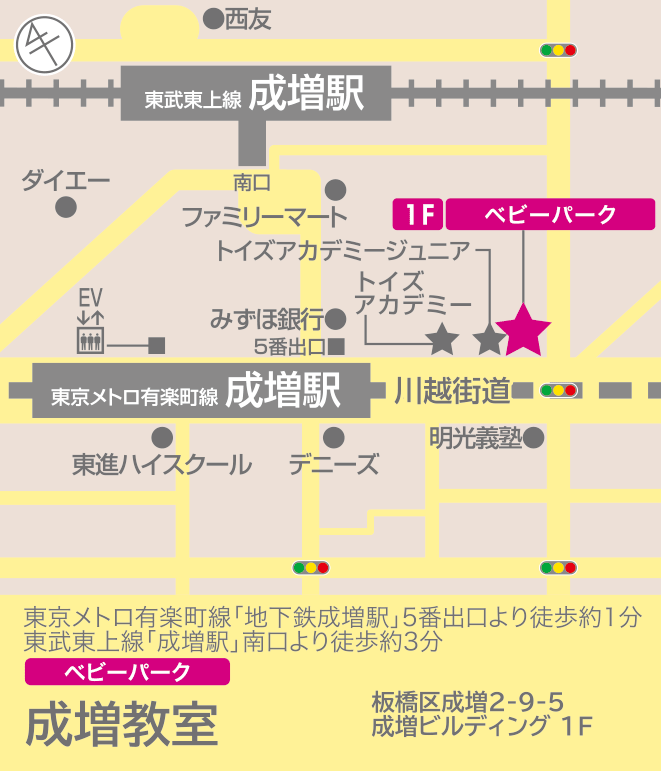 ベビーパーク成増教室は0~3歳の子育てを応援する親子教室。 地下鉄成増駅から徒歩約1分と好立地です。知育遊び・育児相談・ママパパ向けの学びを通して、叱らない育児や子どもの発達を楽しく学び、親子の絆を育みます。