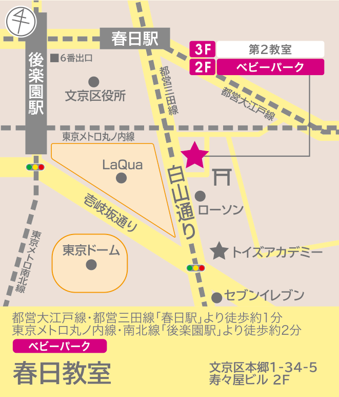 電車でお越しの方 【都営大江戸線・三田線:春日駅】 A2出口を左に出て、白山通りを教室までそのまま直進します。 【東京メトロ丸の内線・南北線:後楽園駅】 6番出口右に出て、すぐの交差点を渡らずに建物沿いに進みます。 左手に「読売理工学院」さんを見ながら直進。前方に「尚美ミュージックカレッジ」が見えてきます。 次の交差点を「東京都交通局 お忘れ物センター」さん側へ渡り、白山通りを右へ歩きます。 左手に「東京都交通局 お忘れ物センター」さん。 右手前方に「La Qua」さんの観覧車を見ながら進みます。 高架下をくぐり抜けると、左手角に見える建物「寿々屋ビル」2階には春日教室、3階に春日第2教室が入っております。 都営大江戸線・都営三田線「春日駅」より徒歩約1分、東京メトロ丸の内線・南北線「後楽園駅」より徒歩約2分です。 ※ビルの入り口は、高架下を抜けてすぐの左手角を曲がり少し進むと右手にございます。 ※3段ほどの段差がございますのでご注意ください。 車でお越しの方 専用駐車場はございませんので、近隣のコインパーキングをご利用ください。 【自転車でお越しの場合】 春日通りと白山通りの交差点に「春日自転車駐車場」がございます。(2時間無料、以降10時間毎100円) 【ベビーカーでお越しの場合】 ベビーカー置き場は2階のエレベーター前です。 |
