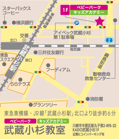 高架下をくぐり、横断歩道を渡った右角にある建物「KADO武蔵小杉」の1階に教室が入っております。徒歩約7分です。