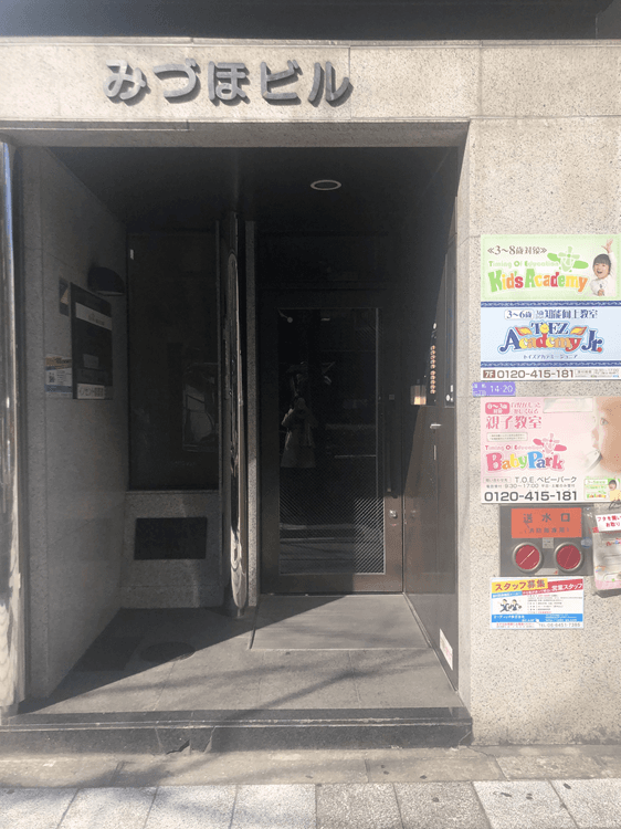 しばらく歩くと左手に見えてくる「大阪みづほビル」(通りから見える看板に「みづほビル」と表示があります)の7階に教室が入っております。徒歩約3分です。