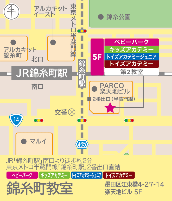 電車でお越しの方 【JR総武線と、半蔵門線にてエレベーターをご利用の場合】 JR総武線錦糸町駅:南口・東京メトロ半蔵門線錦糸町駅:1番出口を出たら、信号をPARCO側へ渡ります。(総武線沿い東側) 正面右側、映画館チケット売り場奥のエレベーターをご利用ください。 【半蔵門線でエレベーターを使わない場合(階段あり)】 東京メトロ半蔵門線錦糸町駅:2番出口に出るとPARCOの下へ出ます。 正面に見える西友さんの向かって右側のエレベーターをご利用ください。 徒歩約2分です。 車でお越しの方 専用駐車場はございません。楽天地パーキングEAST、楽天地ビル東側別棟、近隣のコインパーキングをご利用ください。(有料) 【ベビーカーでお越しの場合】 ベビーカーは教室内左側スペース、壁沿いに置いていただけます。 【自転車でお越しの場合】 専用駐輪場はございません。トーマス楽天地駐輪場をご利用ください。(2時間無料、その後有料) ※教室はPARCO隣接の楽天地ビル5階に入っております。エレベーターを降りると左手に教室入り口がございます。 ※PARCOと楽天地ビルは繋がっておりますが、PARCO営業時間前はPARCOから教室へは行けませんのでご注意ください。 |