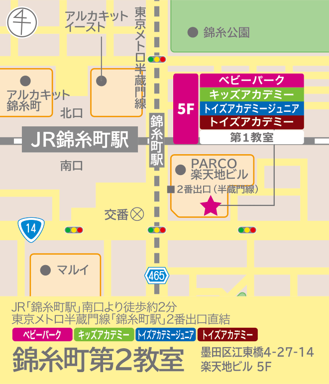 電車でお越しの方 【JR総武線と、半蔵門線にてエレベーターをご利用の場合】 JR総武線錦糸町駅:南口・東京メトロ半蔵門線錦糸町駅:1番出口を出たら、信号をPARCO側へ渡ります。(総武線沿い東側) 正面右側、映画館チケット売り場奥のエレベーターをご利用ください。 【半蔵門線でエレベーターを使わない場合(階段あり)】 東京メトロ半蔵門線錦糸町駅:2番出口に出るとPARCOの下へ出ます。 正面に見える西友さんの向かって右側のエレベーターをご利用ください。 徒歩約2分です。 車でお越しの方 専用駐車場はございません。楽天地パーキングEAST、楽天地ビル東側別棟、近隣のコインパーキングをご利用ください。(有料) 【ベビーカーでお越しの場合】 ベビーカーは教室内左側スペース、壁沿いに置いていただけます。 【自転車でお越しの場合】 専用駐輪場はございません。トーマス楽天地駐輪場をご利用ください。(2時間無料、その後有料) ※教室はPARCO隣接の楽天地ビル5階に入っております。エレベーターを降りると左手に教室入り口がございます。 ※PARCOと楽天地ビルは繋がっておりますが、PARCO営業時間前はPARCOから教室へは行けませんのでご注意ください。 |