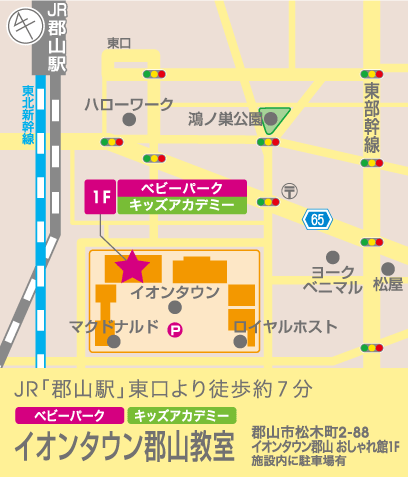 電車でお越しの方 JR線:郡山駅、東口を左に出て直進します。途中左手に「ファミリーマート」さんがあります。 3つ目の信号を渡ると直進方向の道が細くなりますが、そのまま路地へと入り直進します。 路地を抜けた先の突き当りがイオンタウンさんです。 イオンタウンへの入り口はイオンタウンさんに突き当ったら右、次の角を道なりに左折すると左手に見えてきます。徒歩約7分です。 車でお越しの方 イオンタウンさんの無料駐車場をご利用ください。 【自転車でお越しの場合】 駐輪場はイオンタウン駐車場内にあり無料です。 【ベビーカーでお越しの場合】 ベビーカーは教室内にそのまま置いていただけます。 ※教室は、イオンタウン郡山 おしゃれ館1Fにあります。トイザらス向かいの入り口から入ってすぐです。 |