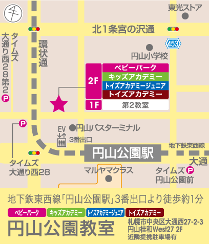 電車でお越しの方 地下鉄東西線:円山公園駅、3番出口を出たら背中方向へ歩き、建物沿いに左へ曲がります。 1つ目の横断歩道を渡り左折。右手すぐのところに見える建物の2階に教室が入っております。徒歩約1分です。 車でお越しの方 近隣に提携駐車場がございます。駐車料金一部負担 (先生から駐車券をお受け取りください。300円の補助券がございます。) ・タイムズ大通り西28 ・タイムズ大通り西28第2 ・タイムズ円山公園駅前 ・タイムズ南2西24 ※駐車場が混みあってる可能性がありますので、余裕を持ってお越しください。 【自転車でお越しの場合】 円山公園1番出口の横、神社の向かいに駐輪場がございます。 【ベビーカーでお越しの場合】 ベビーカーは入り口に置いていただけます。折りたたみのご協力をお願い致します。 ※1階にもベビーパークがございますが、そちらは第2教室ですので、ご注意ください。 |