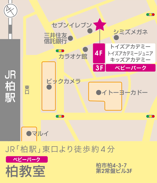ベビーパーク柏教室は0~3歳の子育てを応援する親子教室。JR柏駅から徒歩4分で通いやすく、知育遊び・育児相談・ママパパ向けの学びを通して、叱らない育児や子どもの発達を楽しく学び、親子の絆を育みます。