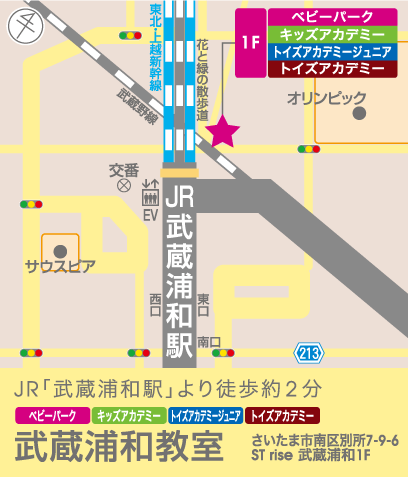 電車でお越しの方 JR線:武蔵浦和駅、東口を左に出たらそのまま直進します。 連絡通路の下をくぐり抜けて線路沿い歩くと、目の前に横断歩道が見えてきます。 横断歩道を渡るとすぐ右手1階に教室が入る建物が見えてきます。徒歩約2分です。 車でお越しの方 専用駐車場はございませんので、近隣のコインパーキングをご利用ください。 【自転車でお越しの場合】 教室前にお停めいただけます。 【ベビーカーでお越しの場合】 ベビーカーは教室内にそのまま置いていただけます。 |