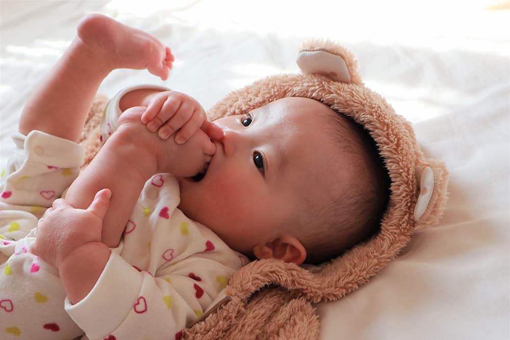 生後2〜3カ月くらいは大脳が発達し始める時期です。手を咥えたり、両手を合わせるような仕草をしたり、その手を見つめたりすることが増えますが、これは大脳が発達し始めた証拠。また感情が生後2カ月までよりも大きくなり、大声で泣いたり嬉しそうに声を出して笑ったりするようにもなります。
