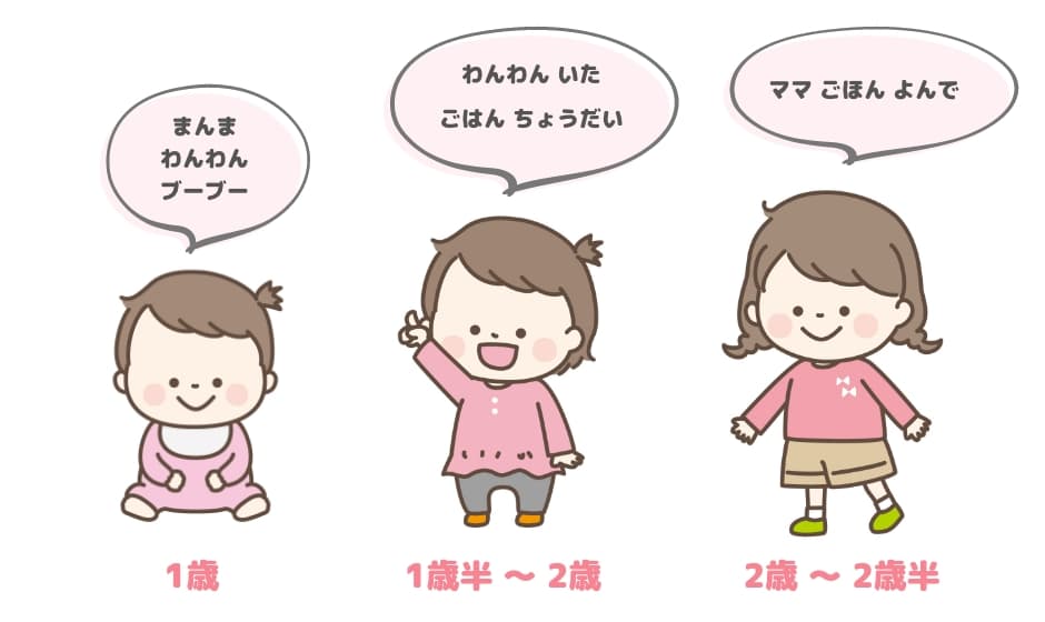 2歳~2歳半くらいになると、「ママ ごほん よんで」「パパ おしごと いく」などの三語文を話すようになります。