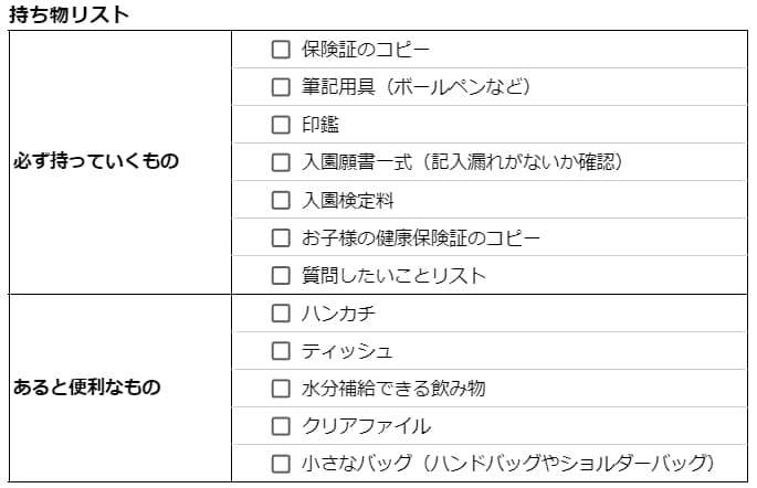 下記の持ち物リストを参考に、園から通知されている書類を確認しながらきちんと準備しましょう。面接当日になってから慌てないためにも、前日にしっかりと持ち物をチェックしておくことが重要です。