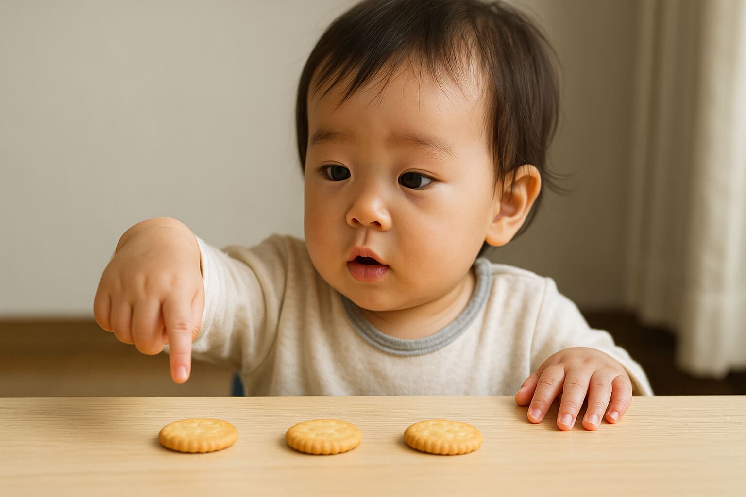 たとえば、1つのお菓子と3つのお菓子を並べたときに、量の違いに目を向けたり多い方を選ぼうとする行動が見られることがあります。これは「数量の感覚」が芽生えてきている証拠です。