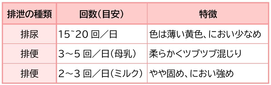 排尿回数は1日15~20回以上、排便回数は1日3〜5回程度が目安とされています(※)。特に母乳育児の場合は、授乳のたびに便が出る赤ちゃんも多く見られます。