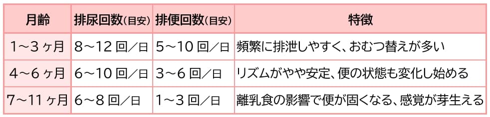 月齢に応じて排泄の回数やリズムが変化します。そうした変化に気づくことで、赤ちゃんの心と体の成長をより実感できるようになります。