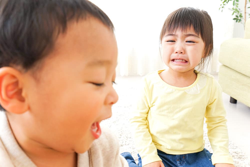 「嫌だ、近くにこないで」という意志表示のために、相手を押したりたたいてしまったりという行動が見られます。この段階の子どもに理屈は通じないので、保護者が代わりに相手に配慮しながら、上手に子どもを遠ざけてあげましょう。大声を出す、噛む、物を投げるというのも大体このパターンです。