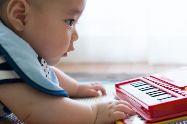 たとえば、鍵盤付きのおもちゃやボタンを押すと音が出るタイプのおもちゃは、押すたびに違う音が出る楽しさがあり、声を出すきっかけになります。
