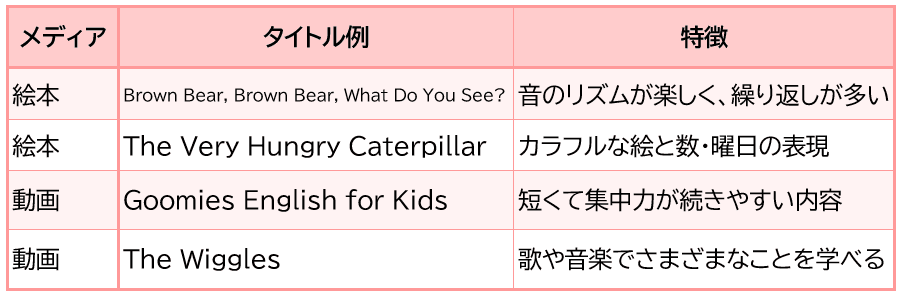 - 絵本や動画で自然な英語に触れる