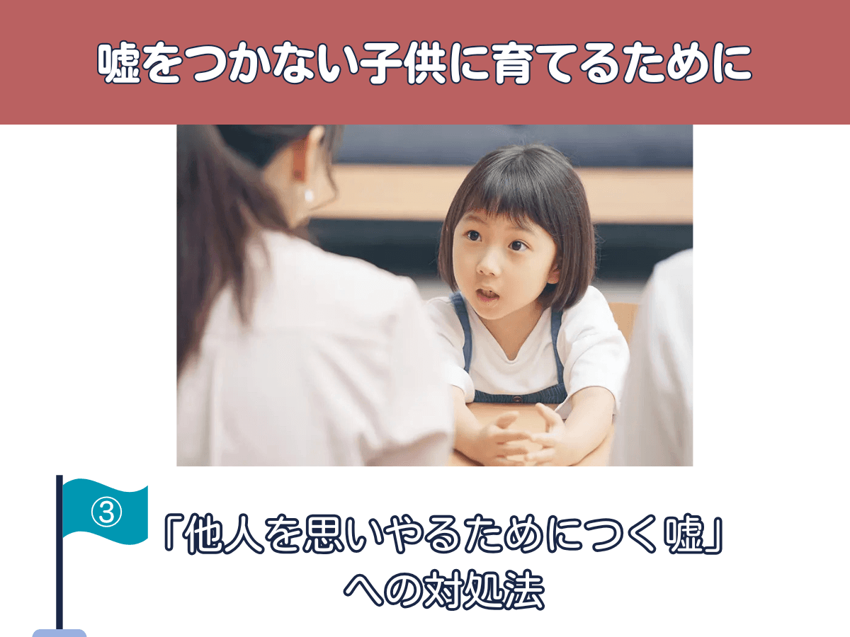 「他人を思いやる嘘」は、子どもがある程度精神的に成長してきたからこそつく嘘で、ある意味では子どもの成長を喜ぶべきシチュエーションなのかもしれません。