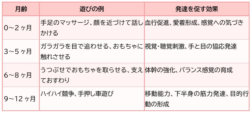 それぞれの遊びがもたらす発達への効果や、赤ちゃんとの関わり方のポイントについても具体例を交えて解説していきます。