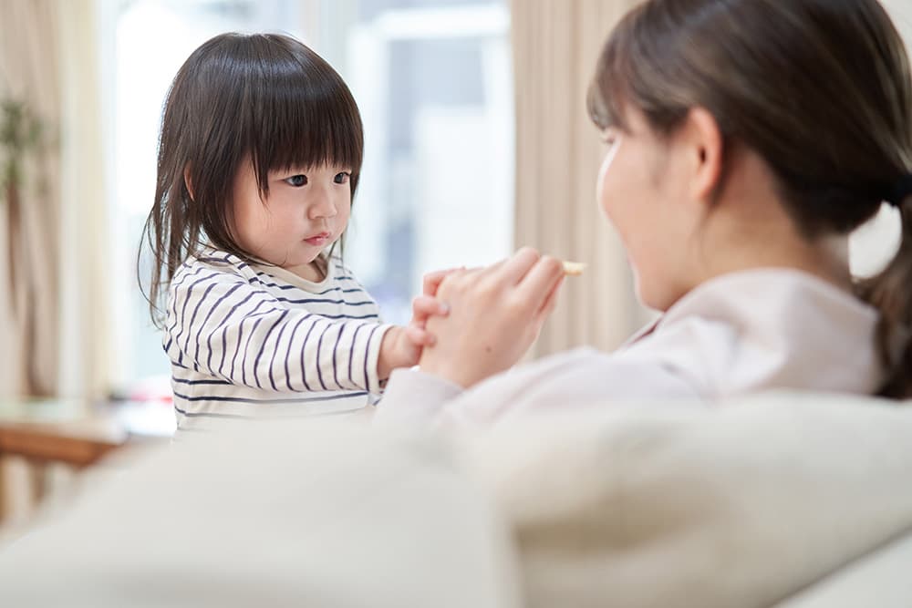 しかし、触ってはいけないものや与えないことを決めているものの場合は、2分以内にお子さまの手の届かないところに片付けたり、その場から離れて下さい。お子さまが我慢できそうにない時は、できるだけ早くその事がらを忘れさせてあげるように大人が工夫をしましょう。