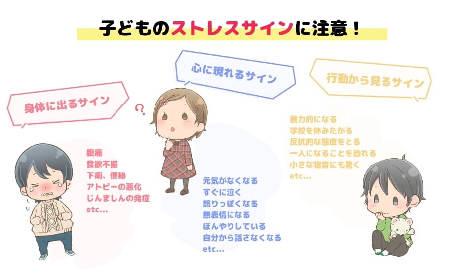 また、赤ちゃんが不快を感じて泣くのと同じように、特に幼児期の場合は「嫌だ」「つらい」という気持ちはあっても、何がどのように嫌なのか、何がつらいのかをきちんと周囲に説明できないことも少なくありません。そして、そのような状態が続くと大きく「身体」「心」「行動」の3つにサインが現れはじめます。