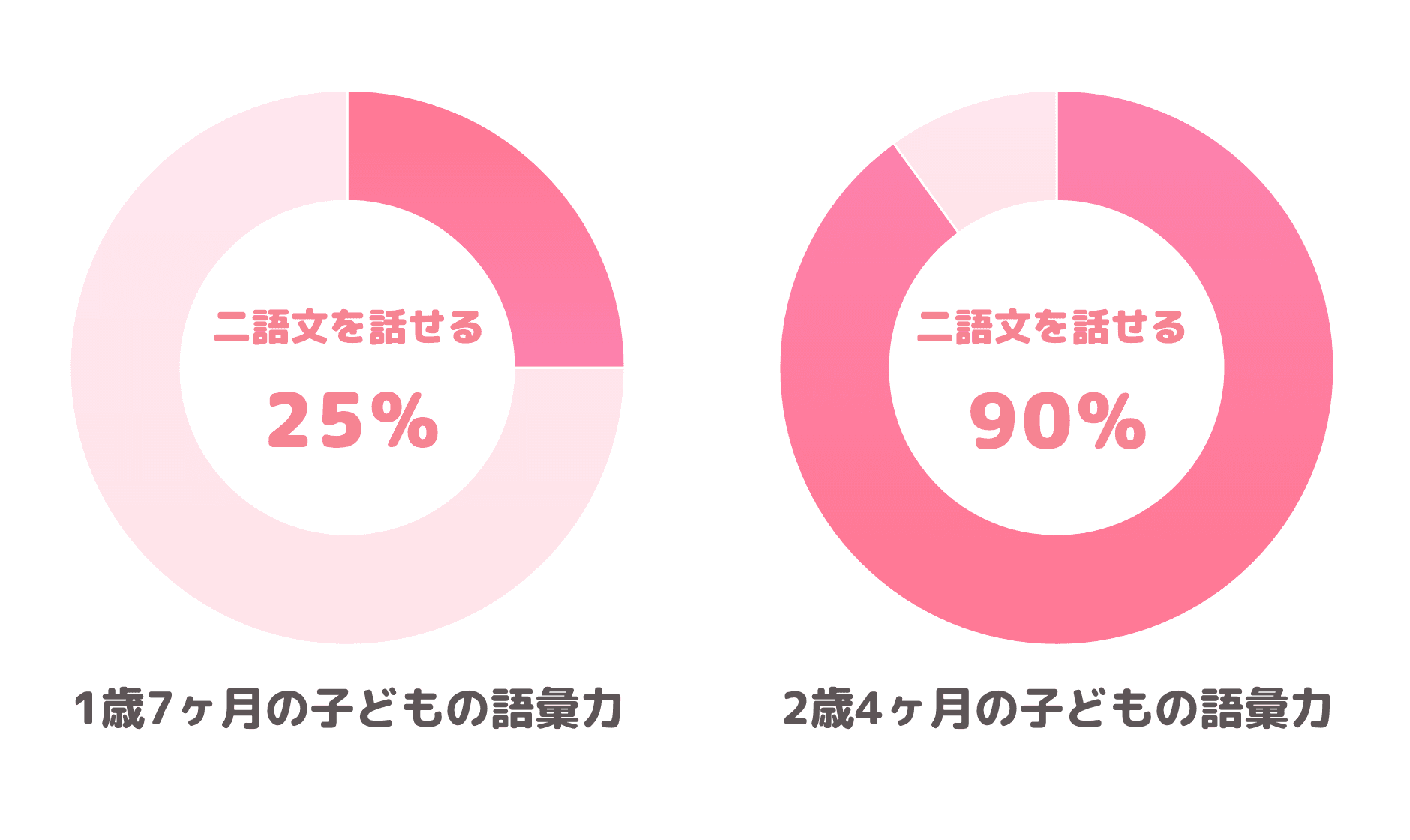 もちろん、言葉の発達スピードには個人差があり、「2歳になったのになかなか二語文が出てこない」ということも十分あり得ます。ただ、乳幼児健康診断などでも用いられているデンバー式発達スクリーニング検査の結果をもとにした統計によると、1歳7か月では25%の子どもが、2歳4か月では90%の子どもが二語文を話し始めます。また、厚生労働省が公開している乳幼児身体発育調査の結果によると、1歳6~7か月の子の94.7%が単語を話しているようです。