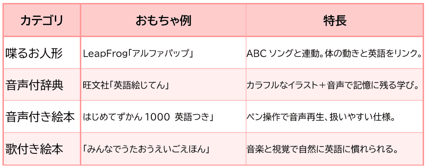 たとえば、音が出るタッチ式の英語絵本や英語で話しかけてくれるぬいぐるみ型のおしゃべりトイなどは「英語で会話する楽しさ」を体感できる良いきっかけにもなります。