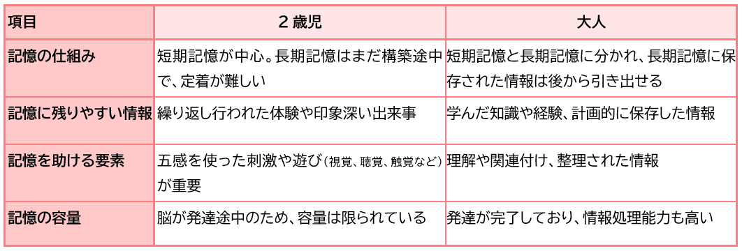 以下の表で、2歳児と大人の記憶力の主な違いを分かりやすくまとめました。