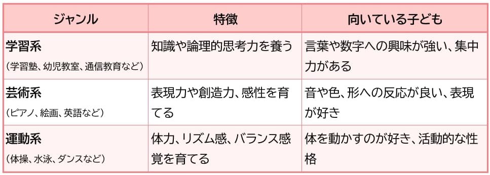 学習系・芸術系・運動系の習い事の特徴