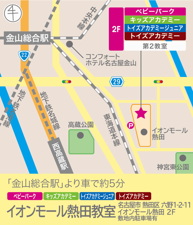 電車でお越しの方 「金山総合駅」より車で約5分 車でお越しの方 施設内に駐車場がございます |