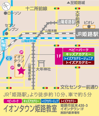 JR線:姫路駅、南口を右に出てイオンタウン姫路店を目指してお越しください。教室は1階に入っております。