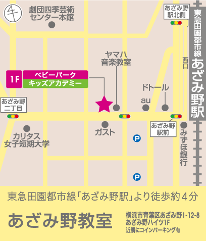 電車でお越しの方 東急田園都市線・横浜市営地下鉄ブルーライン:あざみ野駅、西口を出たら左に歩きます。 交差点を「松屋」さん側へと渡り、駅を背にして「DOUTOR(ドトール)」さん、「三井住友銀行」さんの方へと直進します。 1つ目の信号を超えて、しばらく歩くと右手に教室の看板が見えてきます。 レンガ調の建物「あざみ野ハイツ」1階の奥に教室が入っております。徒歩約4分です。 車でお越しの方 専用駐車場はございませんので、近隣のコインパーキングをご利用ください。 【自転車でお越しの場合】 駐輪場は建物の裏にございます。 【ベビーカーでお越しの場合】 ベビーカーは教室内に置いていただけます。 |