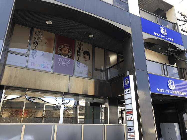 少し歩くと見える黄色い「四谷学院」さんの看板の手前の建物「千葉北口第一ビル」2階に教室が入っております。徒歩約1分です。