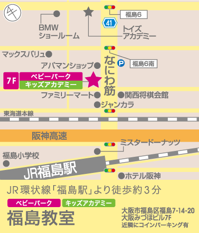 電車でお越しの方 JR環状線 福島駅より 徒歩3分 車でお越しの方 専用駐車場はありませんので、近隣の駐車場をご利用ください。 ※福島教室は「福島教室」と「福島第2教室」がございます。間違う方が多くおられますので、どちらの教室に行かれるかご住所をご確認の上お越しください。  |