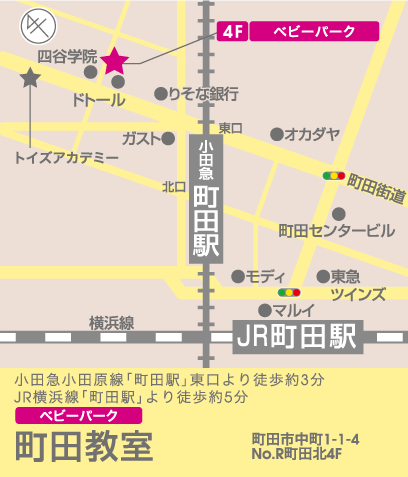 電車でお越しの方 【JR横浜線:町田駅をご利用の場合】 中央改札を出て右側に歩きます。 左手に「OIOI」さんの入り口、右手に「ルミネ」さんの入り口を過ぎてすぐ、左折して直進。左手が「OIOI」さんからパチンコ屋さんに変わったら、道なりに右折。 その後直進すると、小田急町田駅に出ます。フローリスト右手に更に直進、左側にアクセサリー雑貨屋さんがある角を左折。 正面突き当りの階段を上がると地上に出ます。 (ここから先は小田急線からのアクセスと同じです。) 【小田急線:町田駅をご利用の場合】 小田急東口改札を出て左に曲がり、正面突き当りの階段を上がり、地上へ出ます。 (横浜線からお越しの方はここに合流します。) 目の前に「LAWSON」さんが見える分岐点に出ますが、右前方、線路沿いに直進します。 左手に「LAWSON」さん、「焼肉ライク」さんを見ながらまっすぐ進むと、右側に踏み切りが見えてきます。 横断歩道を「りそな銀行」さん側へ渡り、左折。右手に「りそな銀行」さん、左手に「富士そば」さんを見ながら歩きます。 「ドトールコーヒー」さんが見えたら、次の路地を右に入ります。 角から2軒目の建物「No.R町田北」ビル4階に教室が入っています。 車でお越しの方 駐輪場、専用駐車場はございませんので、近隣のコインパーキングをご利用ください。 【ベビーカーでお越しの場合】 ベビーカーの置き場所は教室内です。 ※ドトールコーヒーさん側にも教室のサインが出ておりますが、入り口はドトールコーヒーさんを正面に見て、左側に入ったところです。ご注意ください。 |