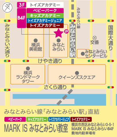 電車でお越しの方 みなとみらい線:みなとみらい駅、「マークイズ連絡口」に直結している建物の、地下4階に教室が入っております。 桜木町駅からも、歩く歩道でアクセス可能です。徒歩約10分。 横浜駅からですと徒歩約15分です。 車でお越しの方 マークイズの駐車場をご利用ください。1時間の補助あり。 みなとみらいカードを作ればさらに1時間無料です。 土日は車が大変混雑するため時間に余裕をもって来室ください。 【自転車でお越しの場合】 駐輪場は3時間無料です。 【ベビーカーでお越しの場合】 ベビーカーは教室前の指定エリアに置いていただけますようお願い致します。 |
