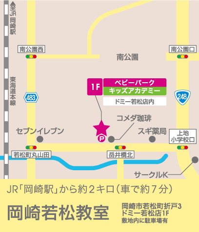 こんにちは!ベビーパーク岡崎若松教室は、汽車・観覧車が人気の南公園すぐ横、スーパーや100円ショップなどが揃った商業施設の中にある教室です。